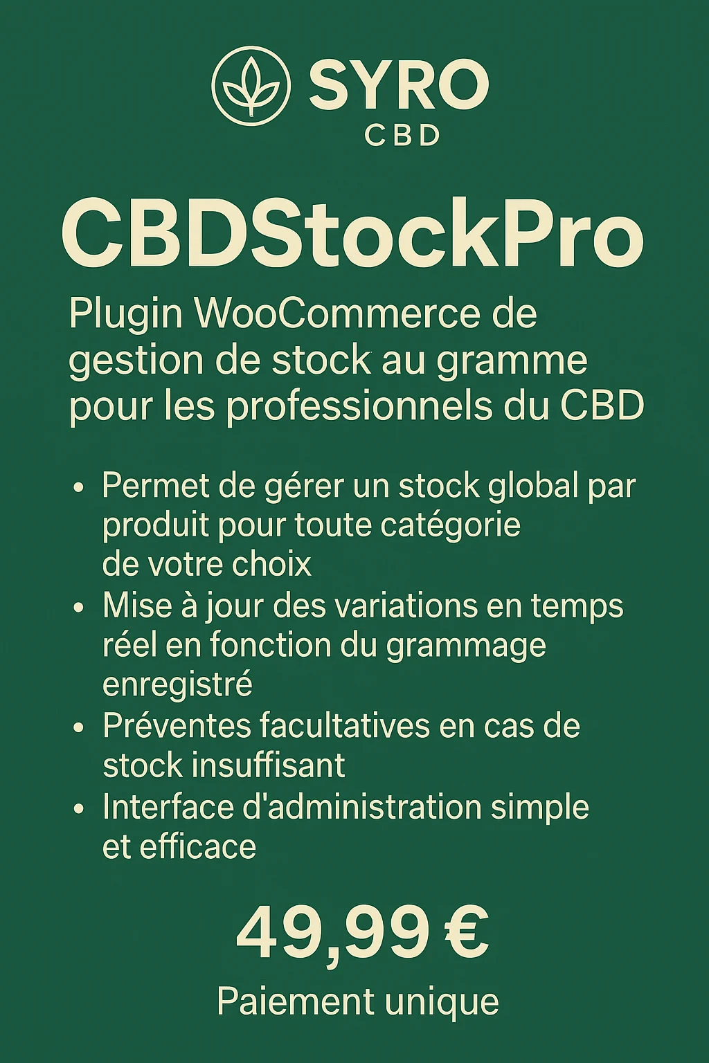 CBDStockPro est une extension WordPress / WooCommerce conçue spécifiquement pour gérer vos produits par grammage : fleurs, résines, ou tout produit pesé.